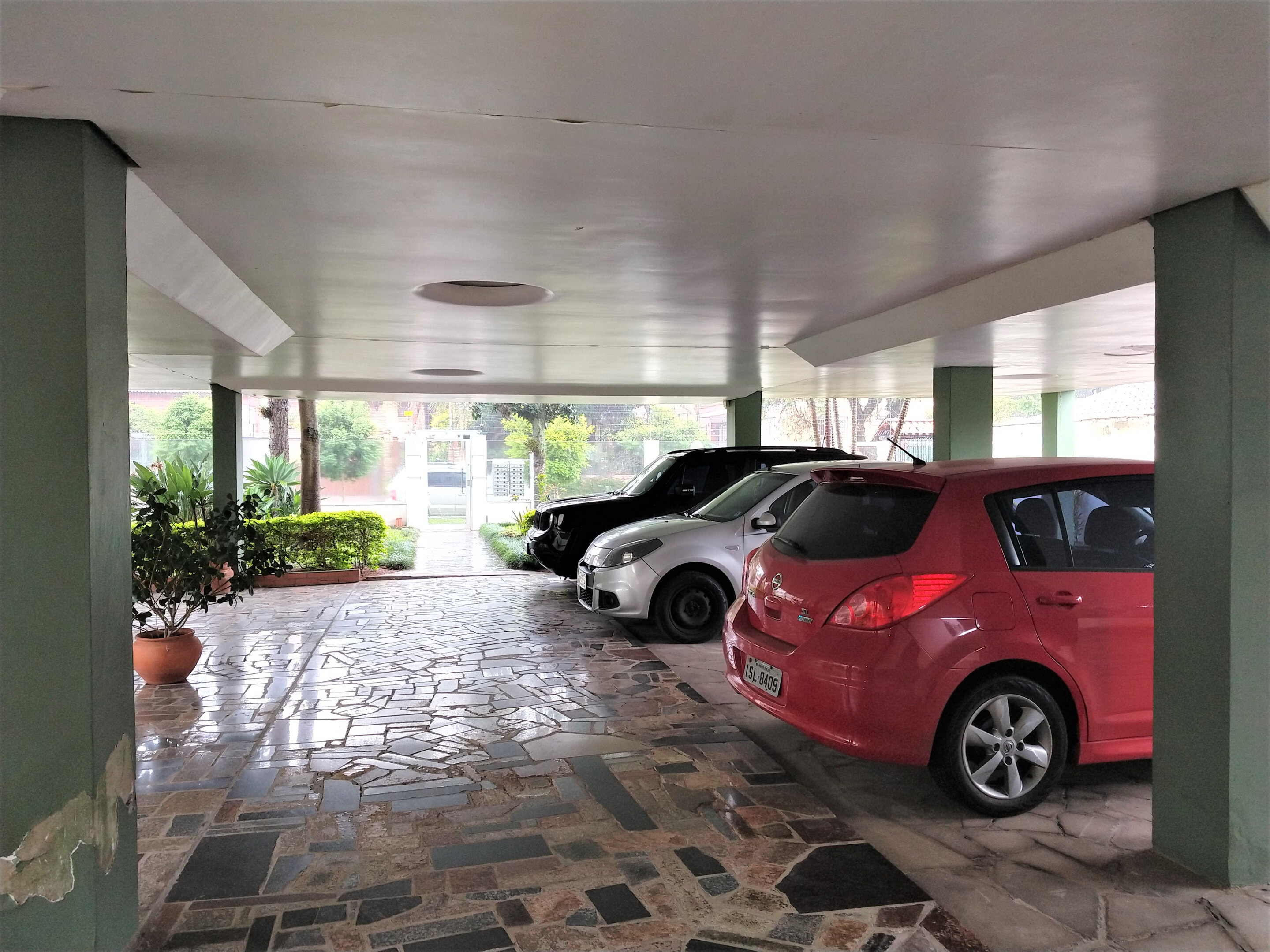 Estacionamento coberto e com uma churrasqueira no local para os churrascos com os amigos.