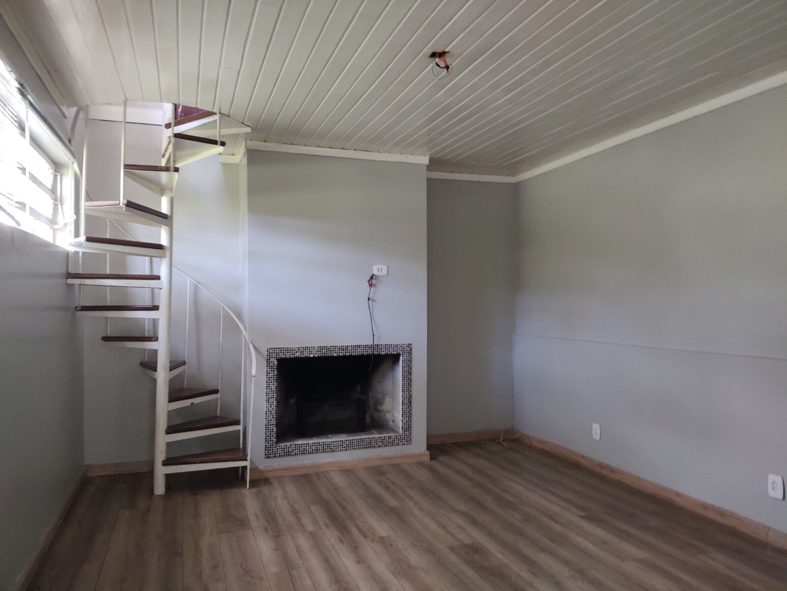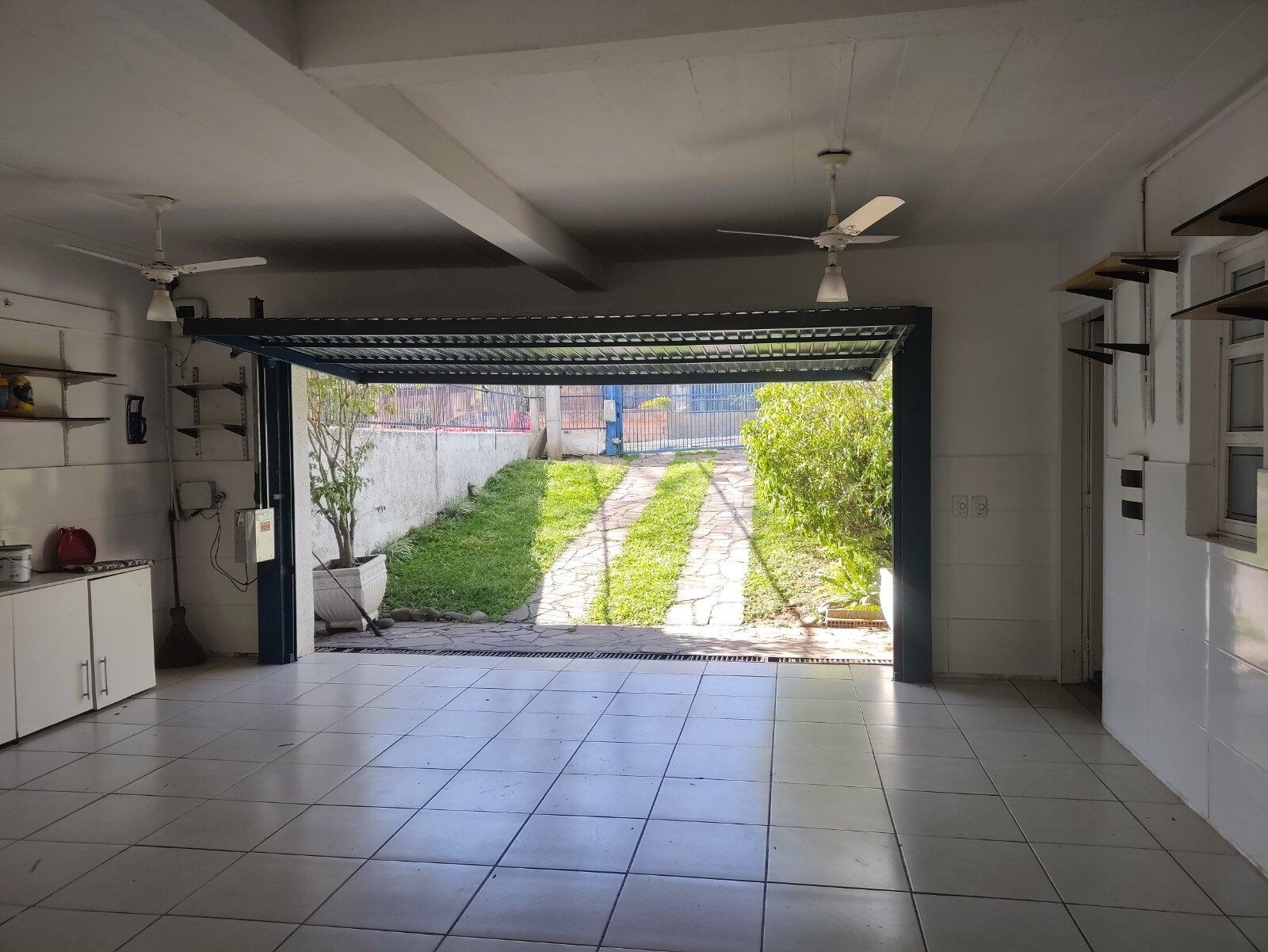 Na parte inferior, conta um uma ampla despensa, uma sala de estar com lareira e com escada que dá acesso ao piso superior, banheiro auxiliar e garagem coberta para três veículos, inclusive, possibilitando o estacionamento na parte descoberta do pátio de mais veículos.