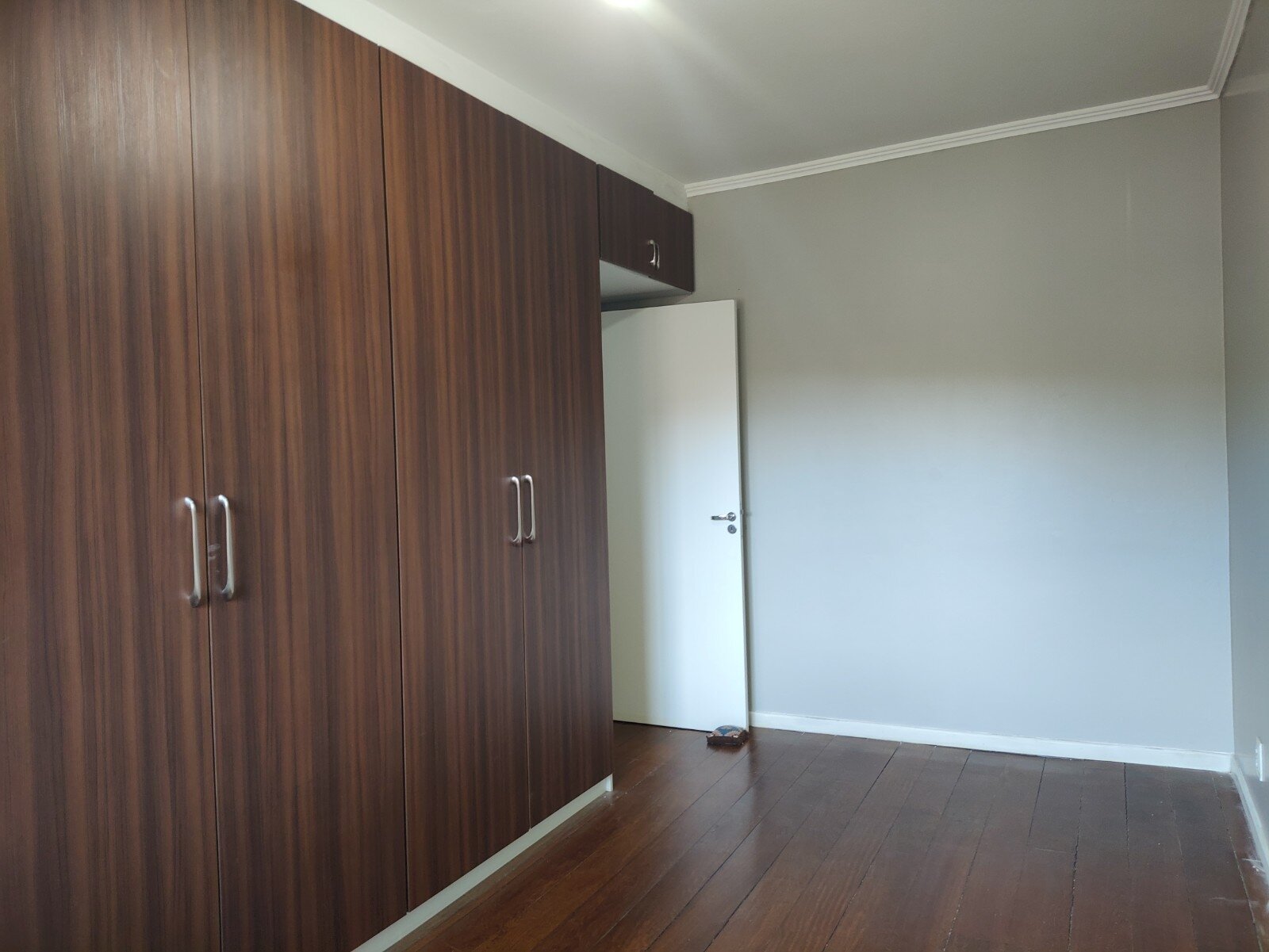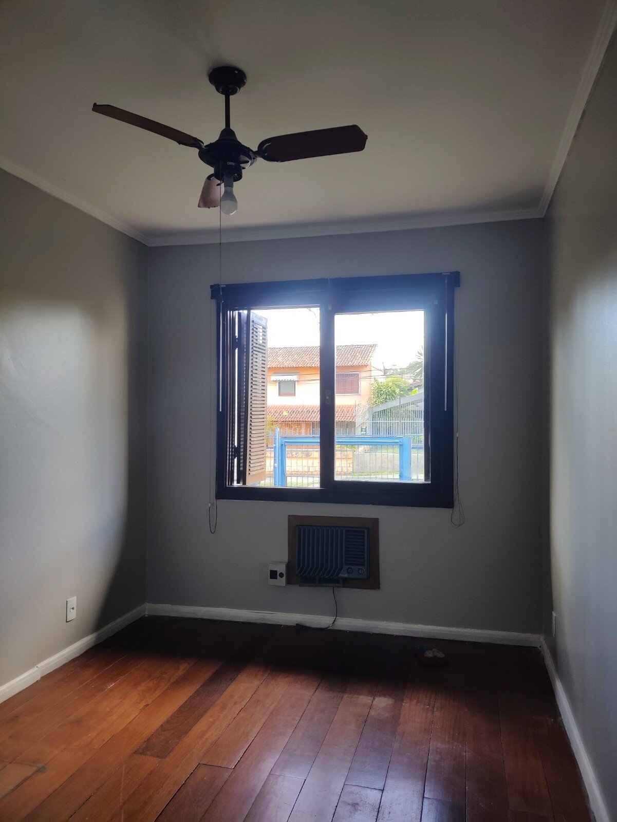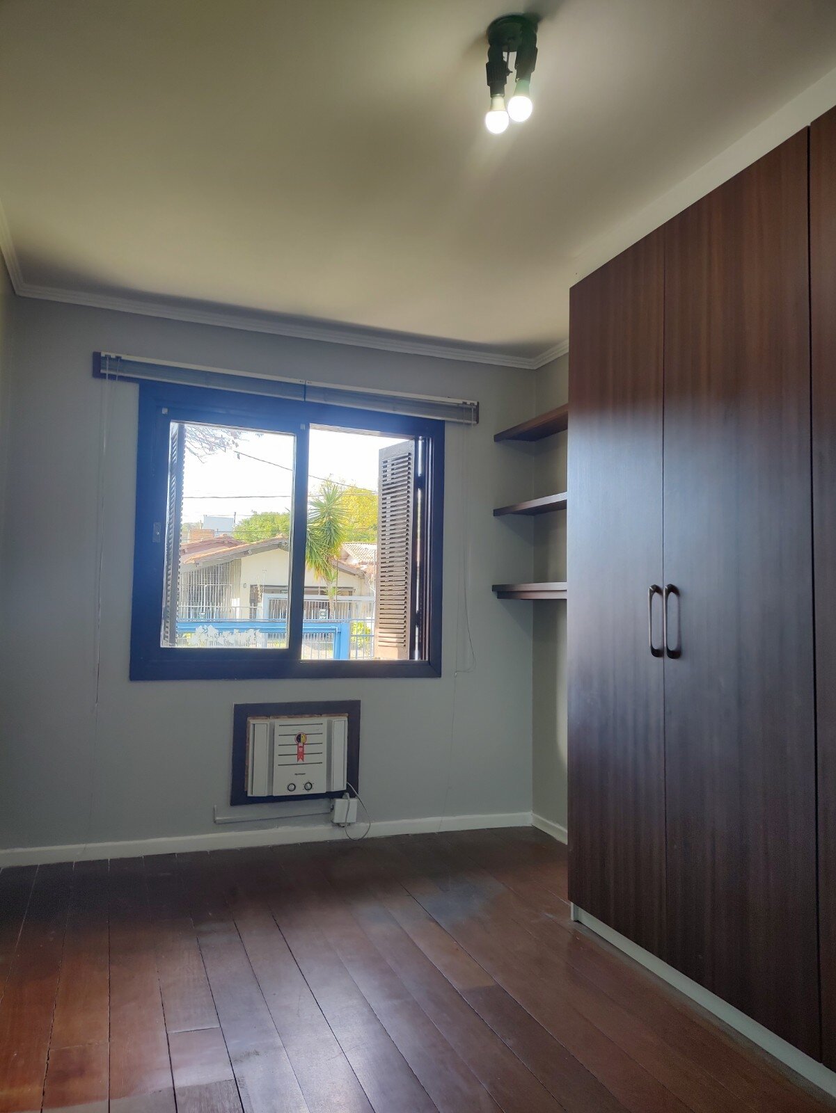 Dormitórios com ar condicionado e ventilador de teto e roupeiro sob medida em um dos quartos.