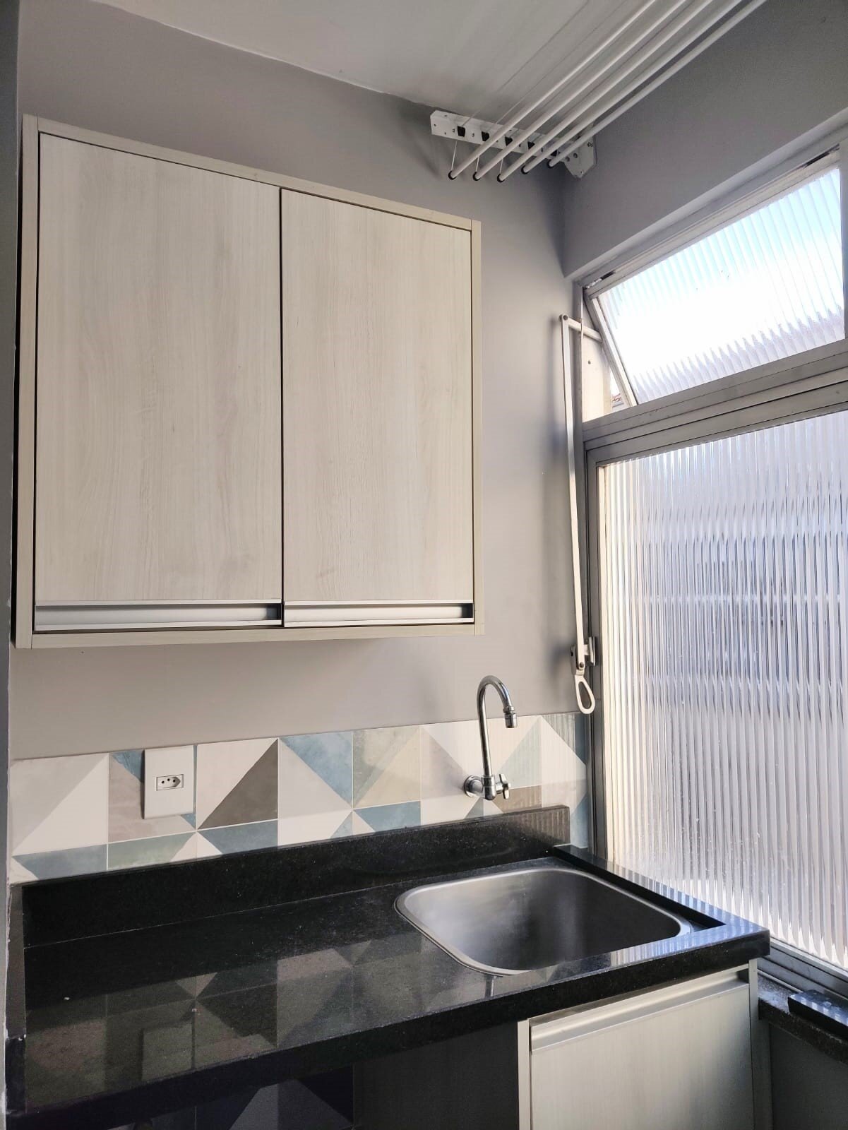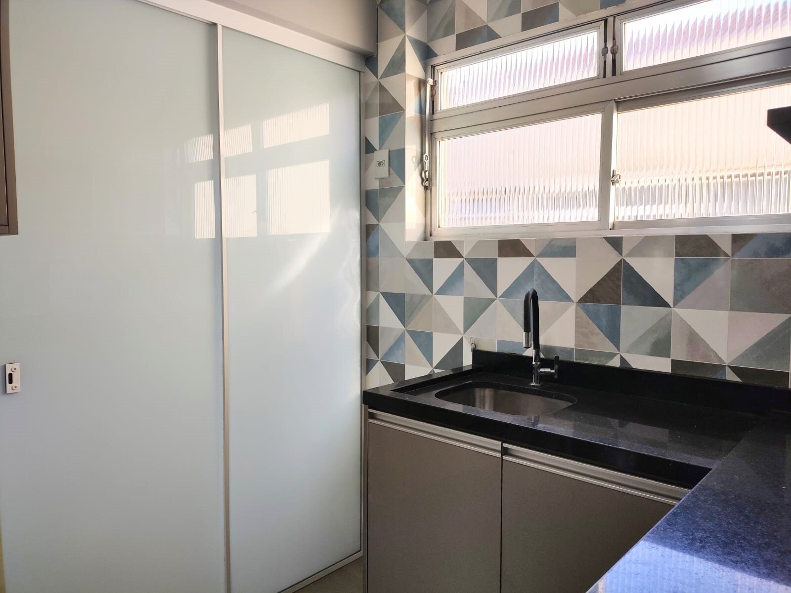 Móveis modernos na cozinha e na área de serviço, com tampo em granito e pia/tanque em inox.