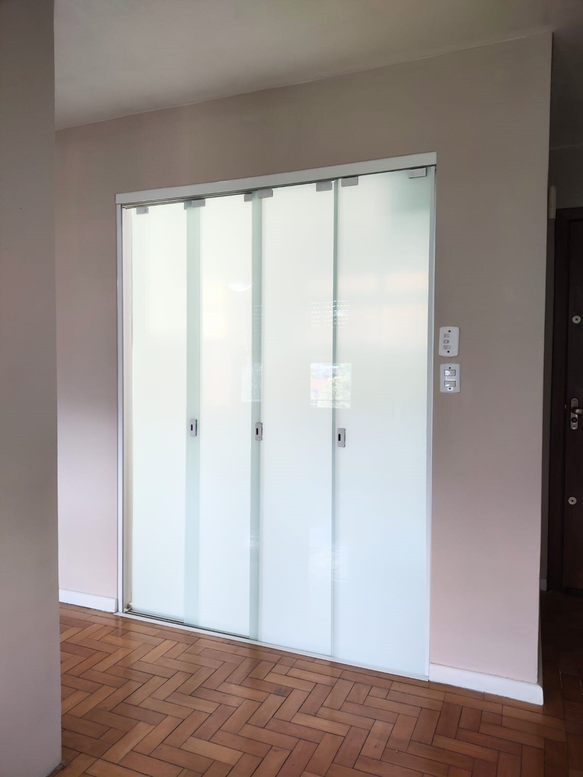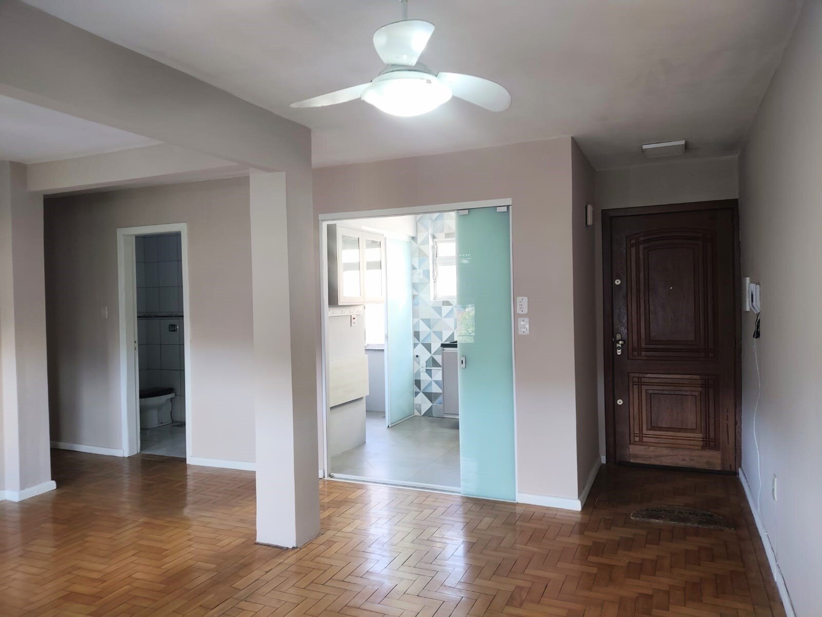 Living para dois ambientes, cozinha com divisória em vidro temperado, oferecendo privacidade e total isolamento dos ambientes.